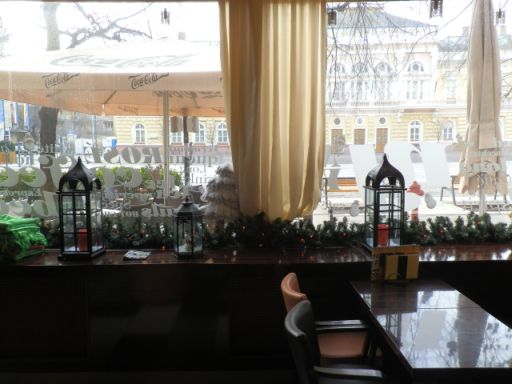 Kis túlzással azt is mondhatnám, hogy ha egy Kossuth téri kávézóban már van szék meg asztal, és valami folyadékot is felszolgálnak, akkor én már szeretni fogom, mert életet visz Szolnok még mindig kicsit szunnyadó főterére. A mai napig tartom ugyanis azt a már többször leírt nézetemet, hogy ezen a téren, körben, mindenütt vendéglátóhelyeknek és kedves kis üzleteknek kellene lennie, hogy ne csak nevében, vagy időlegesen tölthesse be a fő tér funkciót. Szerintem itt kellene működnie a város legjobb éttermének, elsőszámú cukrászdájának, elegáns delikát üzletének és a mai három mellett még legalább ugyanennyi kávézónak. Mert ezek vonzanák a kisebb, de minőségi boltokat, és nemcsak akkor lenne élet a téren, amikor a szökőkútban ingyen strandolás rendezhető. Illetve visszatérne valami abból az időből, amikor még tornyai voltak a Városházának és nem bádog fejdísze.
