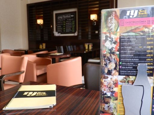 A New York kávézó része, amit a barna különböző árnyalatai határoznak meg, szerencsére nem túlozza el a nevére való visszautalásokat. Az egyik falon van ugyan egy érdekes, az amerikai metropoliszt ábrázoló festmény, de az is inkább művészi alkotásnak tekinthető, mintsem névjegynek. Főleg, hogy a hatalmas ablakoknak köszönhetően a belső tér képére és hangulatára a kilátás erőteljesen rányomja a bélyegét, hiszen a Kossuth tér és a Városháza szinte leül mellénk a kényelmes székekre. Az amerikai életérzést leginkább az étlap gyönyörű, New-York-i fotói jelenítik meg, amelyek olyan hatásosak, hogy elsőre soha sem lehet a kínálatra koncentrálni.