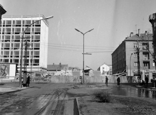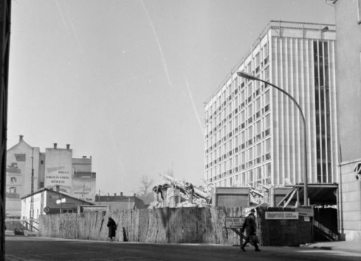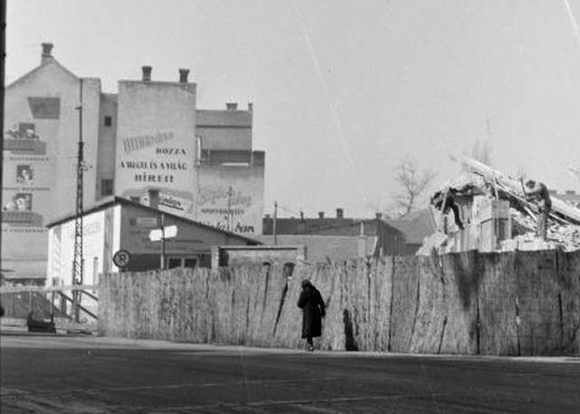 És egyértelműen semmi köze nincs a Hunyady József második képének bal szélén, az építési terület kerítése mögött látható, ferde tetős házhoz. Ami szerintem egy hosszabb távra tervezett felvonulási épület lehetett. Létezésén ugyan a mából nézve csodálkozhatunk, ám a korabeli beruházási sebességeket, illetve a rendelkezésre álló technikát ismerve nem meglepő, hogy a hatvanas évek elején egy komplett lakóház felhúzása tűnt a legkézenfekvőbb megoldásnak egy ekkora bontás és építkezés kiszolgálásához.