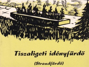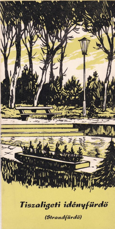 Szolnoki Fürdő Vállalat vezetősége által szerintem 1966-ban megjelentetett, lényegében üresen hagyott kartonborítóba – csak a címoldala lett megnyomva – helyezett 4 oldalas reklámkiadvány tízezer példányban készült a Szolnoki Nyomda Vállalatnál. Hogy hol terjesztették, sajnos nem tudom. Az azonban a szövegek alapján egyértelműnek tűnik, hogy nem elsősorban a szolnokiaknak, hanem inkább a Szolnokra csábítandó belföldi turistáknak szánták, azaz az 1964-65-ben elkészült strandfürdő – és nem mellesleg a Tiszaliget – országos reklámja lehetett. Meglepő, hogy fotók nélküli a kiadvány. Ugyanakkor azt kell mondani, a leírtak is remekül lefestik a korabeli strandot és környékét, aminek akkoriban még a neve sem volt tisztázott: a borítón Tiszaligeti idényfürdő (strandfürdő), belül Tisza-Ligeti Idényfürdő (strandfürdő), máshol pedig fürdő-kombinát megnevezés szerepel.