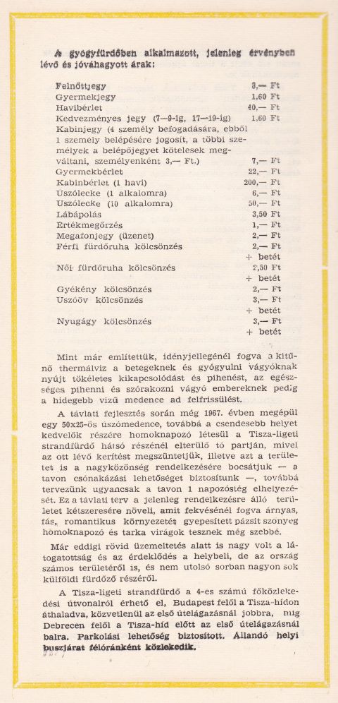 A második szezonra elkészített kiadványban azt írták, hogy két medence várta a pihenni vágyókat. A „hálózatvízzel” feltöltött, 20-22 fokos, 1300 köbméteres, sokszög alakú strandmedence – amiben később a sziget is állt, meg még később a csúszdák végződtek -, illetve a háromosztatú körmedence, amiből egy rész a gyerekeké, kettő pedig a 33-39 fokos termálvizet élvezőké volt. A lassan hatvanéves szöveg szerzője szerint a tiszaligeti termálvíz kitűnően gyógyította a reumás és mozgásszervi megbetegedéseket, az ízületi-, izom- és idegfájdalmakat, de balesetek utáni rehabilitációra is kiválóan alkalmas volt.
