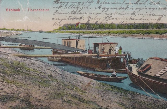 Arról igazán nem tehettek, hogy a majdnem négy és fél éves világégés után csak egy régi, legalább tízéves szolnoki fotót mutató képeslapon írhattak Budapestre. Ugyanis, ha jobban megnézzük a felhasznált, festett képet, akkor a távolban még a régi, fából ácsolt Tisza-hidat látjuk. Amiről pedig tudjuk, hogy 1909 márciusában vitte el a jeges ár. Tehát, ha a mai Tiszaliget helyén lévő fák dús lombkoronáját vesszük alapul – ilyet azért nem festettek pluszban -, akkor kijelenthetjük: az eredeti, fekete-fehér felvétel legkésőbb 1908 nyarán készülhetett.