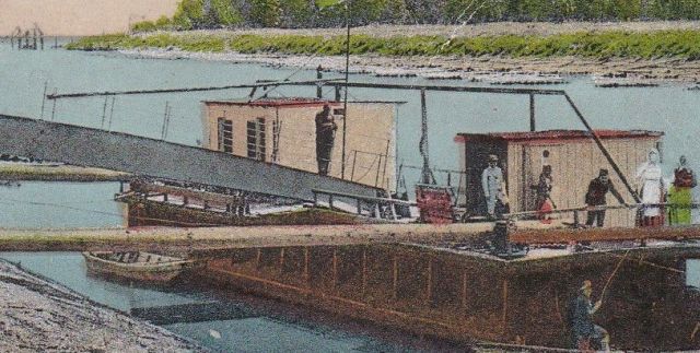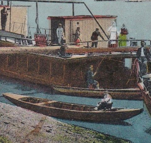 A kép középpontjában egy „úszó mólót” és talán annak teljes személyzetét láthatjuk. Amihez az asszonyok is hozzátartoztak. Az pedig nem volt véletlen, hogy az állóhajónak is beillő járművet három palló kötötte össze a parttal. A gyorsabb be- és kirakodást szolgálták ezek a „hidak”. Az ömlesztett termékeket szállító hajókat ugyanis emberi erővel kellett kiüríteni vagy felölteni, és mivel az idő már akkor is pénzt ért, nem volt mindegy, hogy egyszerre hányan cipekedhettek, és a teherrel vagy az anélkül érkezőknek kerülgetniük kell-e egymást.