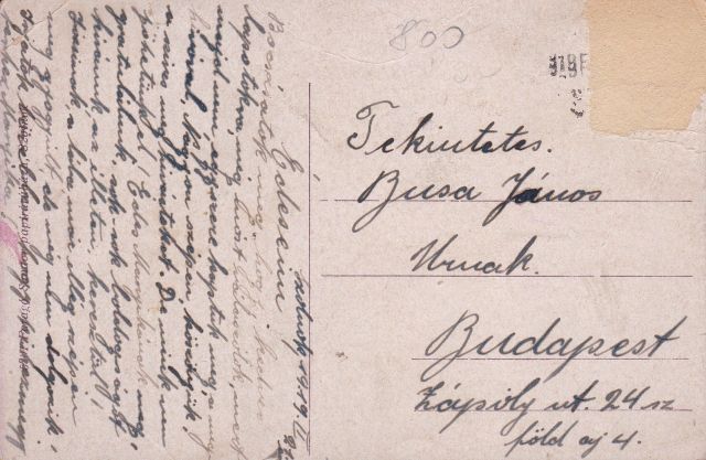 Tekintetes Busa János úrnak Budapestre postázták ezt a szolnoki lapot 1919. február 21-én. Az „Édeseim!” megszólítás alapján feltételezhetjük, közeli családtagok közötti levelezőlap-váltásának egy darabja maradt az utókorra. Mivel pedig a szöveg bocsánatkéréssel indult – merthogy a lap írója a címzettek anzikszára csak késve válaszolt -, hozzátehetjük, hogy rendszeresen adhattak hírt egymásnak a Szolnokon és a fővárosban élő családtagok. Akiket alig négy hónappal az első világháború befejezése után egy esküvő tartott lázban. Sajnos a szolnoki rokonok nem tudtak Budapestre utazni emiatt, de e lap útján meggratulálták Manyikát. Majd két sorral lentebb azért megkérdezték, hogy de mégis kihez megy férjhez Manyika. Egyébként a szolnokiak beszámoltak a saját egészségi állapotukról, kitérve valami lábfájásra és a gyerekek jó állapotára. No és Hermina néniről sem feledkeztek meg, akiknek külön is kézcsókjukat küldték.