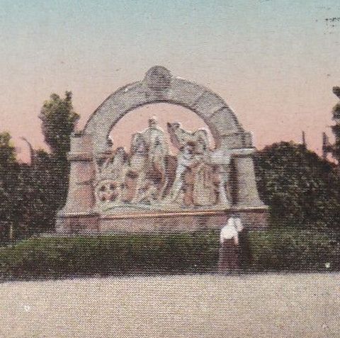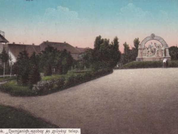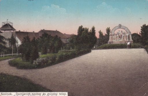 Az anziksz képes fele egyébként különlegesen szép kivágásban mutatja a Szolnoki Művésztelepet és Radnai Béla Damjanich-emlékművét a Zagyva felől fotografálva. Ez utóbbi miatt biztosak lehetünk abban, hogy a felvétel csak 1912 után készülhetett, hiszen a carrarai márványból készített négyalakos alkotást az év március 19-én leplezték le. Ha tippelnem kellene, akkor azt mondanám, hogy maximum egy-két évvel az avatás után készülhetett a fotó, hiszen a növények még viszonylag kicsik, és a kavicsos sétány is elég rendezett. Illetve nem gondolnám, hogy a háború éveiben nagyon lett volna lehetőség hasonló fotók készítésére. Bár, ki tudja?