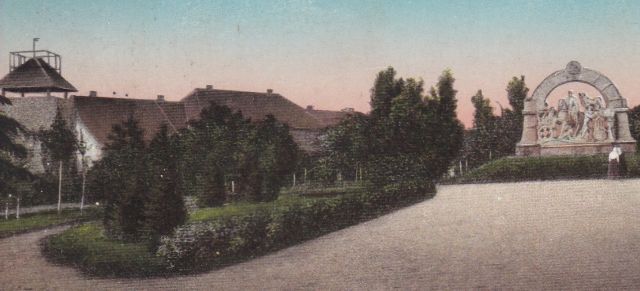 Az azonban biztos, hogy a színezésre használt felvételből csak egy állhatott a kiadó rendelkezésére, ugyanis a szobor előtt – a mai lépcsőnek még nyoma sincs – két, hosszúszoknyás nőalakot is ki lehet venni. Háttal a fotósnak. Akiket nyugodtan bele is festhettek volna a zöld és a piszkosszürke háttérbe, soha senki nem vette volna észre. A nagyon ügyes kezű retusőr azonban meghagyta őket, ha már ilyen alapanyag került a kezébe. Ami, mint utaltam rá, nagyon szépen komponálva mutatja meg az emlékművet, a művésztelepet és a bohém művészek által felépített szolnoki várromot. Aminek tetejében kilátó, alsó részében pedig borozgatásra alkalmas „pince” volt eredetileg. De szögezzük le ismét: semmi köze nincs még az utolsó szolnoki várhoz sem.