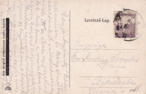Meglepő titkokat tudnak őrizni a régi képeslapok. Lehet, hogy csak nyomdahiba, lehet, hogy van rá okos magyarázat. Mindenesetre elsőre elég érdekes ennek a képeslapnak a kiadója: Kiss Margitné (?) dohánytőzsde, Szolnok. Nem a dohánytőzsdével van a probléma, az nagyjából érthető, mondjuk azt: dohányboltos, dohányáru kereskedő. A cégtulajdonos neve a furcsa. Nem én írtam el. Ha valaki, akkor az a nyomdász, aki bő száz évvel ezelőtt ennek a festett képeslapnak a hátoldalát kiszedte. És nem tűnt fel senkinek az elírás, hiszen a lap forgalomba került, különben nem adhatták volna postára 1918. június 26-án. Persze az is lehet, hogy csak a mából nézve furcsa a Kiss Margitné. Ha valaki tudja a megoldást, kérem, árulja el!