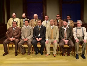 A tízedik, szerepe szerint bicskanyitogató gondolatvilágú esküdtet alakító Zelei Gábor végre egy egész előadáson keresztül mutathatja meg színészi nagyságát. A bunkó, saját világába bezárkózó, önmagán kívül senkit meg nem hallgató amerikai fickóból tényleg mini drámát farag, miközben minden gesztusával, megszólalásával szolgálja a nagy egészet és a többieket. De ugyanez mondható el a kelet-európai, első generációs bevándorlót alakító Mészáros Istvánról is, aki megmutatja, hogy az újonnan érkezettnek sem megalázkodnia, sem a helyieket hülyének néznie nem kell. Ónodi Gábor számomra olasz, ügyeskedő esküdtje pedig arra a legjobb példa, hogy egy kicsit egyszerű, kicsit önimádó figura is lehet fontos láncszeme egy valóban együttműködő csapatnak. Ráadásul egyetlen pillanata sem volt az előadásnak, amikor ne hozta volna a figuráját a folyamatosan rugózó lábával, a rajzolgatással vagy éppen a toll csattogtatásával.