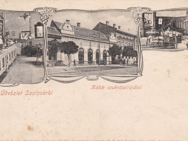 A három felvételt Szigeti Henrik készítette, akinek az előző századfordulón valahol a közelben volt a műterme, talán átellenben – a mai Árkád helyén -, az ívesen kanyarodó földszintes házak valamelyikében. A Székesfehérvárról Szolnokra települt fotós minden bizonnyal jó kapcsolatokat ápolhatott a Kunszentmártonból a megyeszékhelyre beköltöző cukrásszal, amit nemcsak ez a képeslap bizonyít, hanem az is, hogy Szigeti a majd 1905-ben – tehát e lap postázása után – elkészülő szecessziós banképületből 1910 után a Kádár-cukrászda épületébe tette át székhelyét.