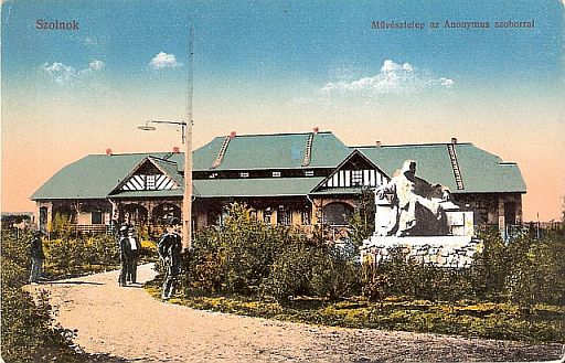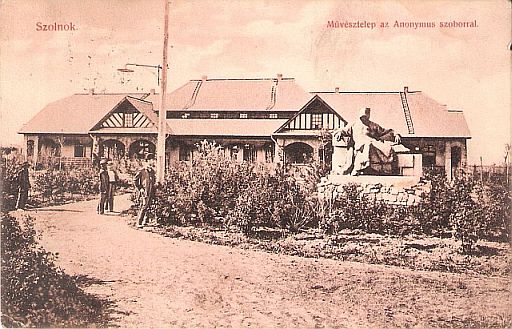 A fotó igazi különlegessége a jobb szélén álló és a négy megörökített ember által is nézett Anonymus szobor. Ami természetesen nem azonos a Városligetben, a Vajdahunyad-várában ma is láthatóval. Viszont szoros a kapcsolata vele, hiszen a híres fővárosi bronzszobor úgynevezett nagymintájáról – ha jól értem a leírásokat: gipszmintájáról – van szó. A szobrász, Ligeti Miklós ugyanis rendszeres látogatója volt a frissen alakuló Szolnoki Művésztelepnek, és a később Budapesten felállított szobor mintáját Szolnokon készítette el. Ami itt is maradt. Így miközben Budapesten is volt egy Anonymus szobor, Szolnok is büszkélkedhetett egy ilyennel a művésztelep parkjában. Egészen 1919-ig, amikor – feltételezem – a tiszai átkelésért folyó küzdelmek során elpusztult.