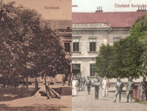 Az előző századforduló környékén tehát még senkit sem zavart, ha fotók készültek például a szolnoki Császári és Királyi katonai gyalogos laktanyáról. Amik aztán egy bizonyos Manó keresztnevű kiadó – a név elejét levágták a lapról – gondozásában, színesben, Özv. Lőrinczy Gyuláné, Állomás-tőzsde kiadásában pedig fekete-fehérben képeslapok is lettek. Sőt, a színes verzióra az is pontosan felkerült, hogy a felvétel a 68-as gyalogezred laktanyáját ábrázolja Szolnokon, míg a másikra csak annyit írtak a város neve mellé: katonai gyalogos laktanya. Elsőre azt gondoltam, hogy a közel azonos beállítású lapokhoz használt fotók ugyanakkor készültek, csak a kép szereplői lettek közben többen vagy kevesebben.
