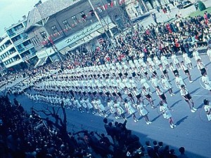 Azt kell, gondoljam, hogy csak a következő három kép készülhetett 1965. május elsején, vagy esetleg egy-két évvel később. Hogy az öt kép nem egyszerre készült arra részben az időjárási viszonyokból, részben a tér fáinak megmetszett koronáiból, illetve a fordítva nagyított képen látható, már világosszürke-kék rendőr egyenruhából következtetek. Ez a kép is a városháza erkélyéről készült, de ugye a felvonulók mindig a Tisza-híd irányába haladtak, soha nem fordítva. A dísztribün és a múzeum melletti – ma már nem álló – épület földszintjén lévő feliratok mutatják, hogy mi is ezzel a képpel a gond. (Ezt a képet azóta rendes változatban is megkaptam.)