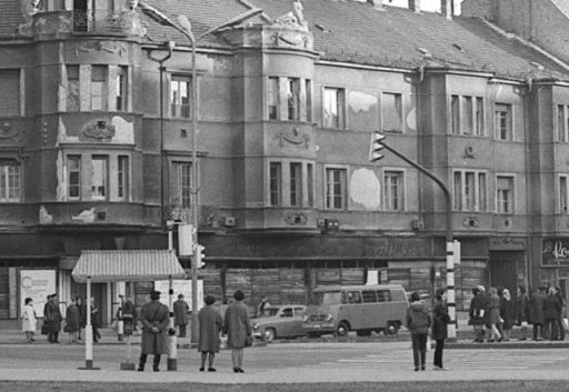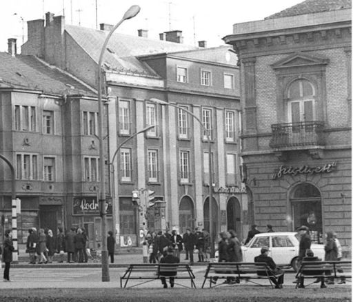 A kép készítése idején még nem túl nagy a forgalom a városban. Bár gyalogosokkal tömve a belváros, összesen öt autó tűnik fel a képen. A piac irányából egy GAZ teherautó és egy Warszava dugja ki az orrát. Szemből egy régi Nysa és talán egy Moszkvics érkezik, míg a Beloianniszon egy 353-as, azaz kocka Wartburg várakozik. A második fotón se nagyobb a forgalom, és nem is a Trabant, a mögötte álló FIAT 127-es és M24 Volga az érdekes a képen, hanem a Nerfeld-palota tetején lévő fényreklám.