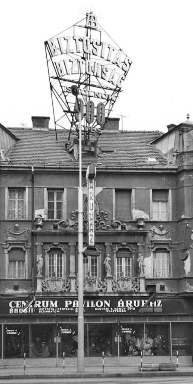 Ha pedig ez így van, akkor ismét fel kell tennünk a kérdést, hogy ha 1969-ben valóban életveszélyes állapotba került ez az épület, akkor öt vagy hat évvel később miként működhetett benne a Háziipari szövetkezet üzlete, a Cooptourist irodája, és a bank felőli végén a fodrászat. Tény, hogy a Centrum ekkor már nincs az épületben, amit a sarki kirakatok fölé szerelt üvegreklám is mutat. Felnagyítva ott az olvasható, hogy a Centrum Pavilon Áruház a Ságvári körút 59/b. szám alatt, a piactéren található. Ám a felirat alatti kirakatokat mintha a Centrum használta volna.