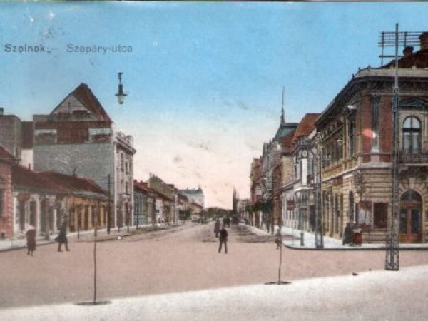 Ezt a képeslapot igazából a felhasznált, festett fotó előterében látható két facsemete miatt vettem meg. A fiatal növények ugyanis valahol az Árkád és az 1-es parkolója közötti zebra helyén, vagy attól egy kicsit a mai Szapáry és Baross utcák kereszteződésének közepe felé állhattak. Elválasztandó Szolnok korabeli főutcáját a Szapáry utat lezáró, szecessziós Kereskedelmi Bank előtti járdától. Ez a két, kis fa szépen megmutatja, hogy a belvároson áthaladó későbbi országos főút milyen szűkületen haladt át Szolnok korzójánál. Mivel a későbbi képeken nem nagyon látni terebélyes fákat a hatvanas években elbontott – ezen a képen ugye nem látható – banképület előtt, nem hinném, hogy ez a két csemete komolyabb kort élhetett volna meg.