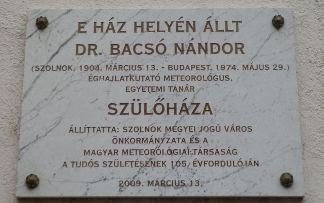 Érdekes egyébként, hogy az utca átkeresztelésére nem 1990-ben, csak két évvel később került sor. Miként az is, hogy az új névadó, Bacsó Nándor (1904-1974) csak akkor kapott Szolnokon utcát, miközben a város szülöttjeként a hazai meteorológia egyik legnagyobb szaktekintélye volt. A Verseghyben végzett Bacsó 1927 óta foglalkozott az időjárással és annak hatásaival, előbb az Országos Meteorológiai Intézet munkatársa volt, majd az Agrártudományi, 1967-től pedig a Kertészeti Egyetem tanára lett. A Magyarország éghajlata című munkája szerintem a mai napig használható alapmű a földrajzban. És, ha már érdekességek: Bacsó Nándor szolnoki emléktáblája nem ebben az utcában, hanem egykori szülőháza helyén, a Mária utca végén álló társasház oldalán található.
