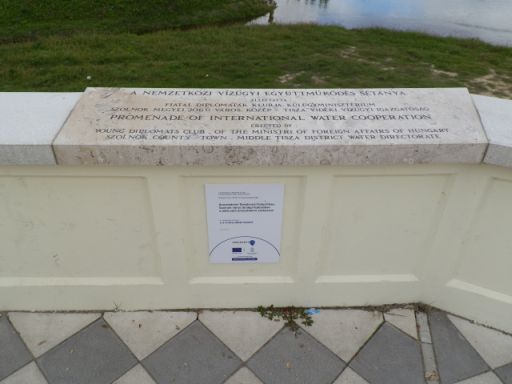 Ha azonban a torkolathoz legközelebb állva a mellvéd tetejére pillantunk, egy méretes emléktábla révén megtudhatjuk, hogy A nemzetközi vízügyi együttműködés sétányán állunk. A kétnyelvű tábláról az is kiderül, hogy azt a Fiatal Diplomaták Klubja – azaz a Magyarországon működő nagykövetségek harmincas munkatársai – a Külügyminisztérium, Szolnok városa és a Közép-Tisza Vidéki Vízügyi Igazgatóság állítatta. A mikor és a miért kérdésekre a helyszínen már nem kapunk választ, de az okostelefonok és a Google korában ez már nem okozhat problémát. A táblát a tavalyi Vízügyi világnapon, azaz 2013. március 22-én helyezték el. Apropója pedig a fiatal diplomaták szolnoki látogatása volt, akik a Zagyva és Tisza új, városi védvonal-építkezésének első szakaszát is megtekintették akkor.
