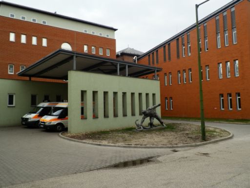 Lehet, tévedek, de emlékeim szerint a Kígyóölő című szobor pár éve még a megyei kórház kertjének a városhoz közelebbi sarkában, az egyik régi pavilonépület előtt, arra merőlegesen, háttal a kerítésnek állt. Ezért hittem sokáig, hogy talán eltűnt. Aztán persze örömmel fedeztem fel jelenlegi helyén, a régi épületek közé első osztályú módon beillesztett új sürgősségi és ügyeleti részleg előtt, a mentőbeállónál. Emlékeim alátámasztása érdekében azonban átlapoztam a 2012-ben megjelent Egy ember fontosabb, mint az egész világ című, a Hetényi Géza Kórház történetét bemutató könyvet, és megállapíthattam: ez a szobor még legalább három másik helyen is állt már az intézmény kertjében.