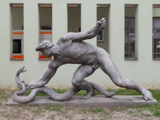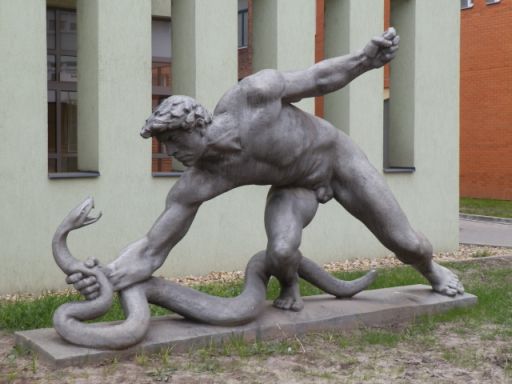 Mindezekből pedig nemcsak az következik, hogy Szomor László (1908-1980) alkotása elég sokat vándorolt a kórház udvarában az 1960-as felállítása óta, hanem az is, hogy az alkotást hol feltették egy talapzatra, hol meg levették róla. Jelenleg, nem túl esztétikus módon, a földbe süppedve áll a kígyót legyőző férfi kompozíciója. A változó talapzat esetleg igazolhatja azt a Köztérképen olvasható vélekedést, miszerint a szobrot eredetileg valamelyik épület homlokzatára szánták, csak éppen az építők nem alakítottak ki neki megfelelő helyet. A szocializmus szobor rendelési szokásait ismerve, ahhoz nem férhet kétség, hogy az 1960 körüli nagyobb beruházáshoz kapcsolódóan kapta a mester az állami megrendelést.