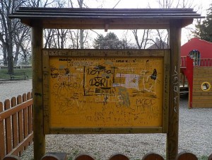 A Tisza-parton, a református templomnál lévő - egyébként kulturált - játszótéren lévő hirdetőtábla két évvel ezelőtt is hasonlóan nézett ki. Annyi a változás, hogy a városi folklór alpári hangú művelői sokat azóta is dolgoztak rajta, gondolom, a felnövekvő generáció okítása céljából. Olvasgassák! És döntsék el, hogy így van-e ez rendjén.