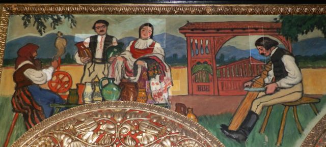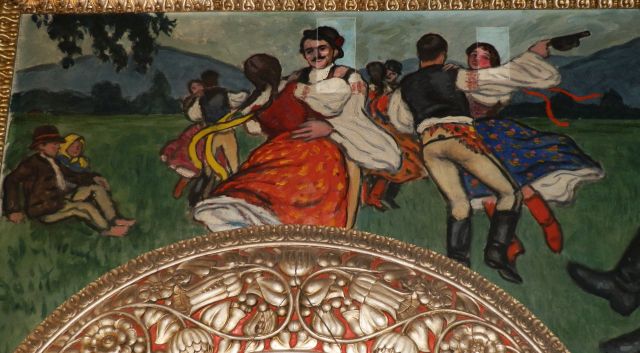 Az éppen felújítás alatt álló marosvásárhelyi Kultúrpalota azonban nemcsak építészei révén kötődik Szolnokhoz. Hanem legszebbnek tartott Tükörterme díszítése okán is, amiről azonban helyben is kevés szó esik, hiszen az díszes ólomüveg ablakok, a falakat borító gazdag díszítettség, és a termet két végén lezáró tükrök elviszik a „fényt” a helyiség négy festményéről. Ezek a háromosztatú velencei tükrök fölött találhatóak – akár kettőnek is tekinthetjük őket -, és a székely nép életéből vett jeleneteket ábrázolnak. A bejárati ajtóhoz közelebb lévő tükör fölött, jobb oldalon azonban észre kell vennünk az alkotó aláírását, aki nem más, mint a Szolnokon született és meghalt Pólya Tibor (1886-1937) festőművész. Bizonyítékom nincs rá, de talán nem zárható ki, hogy az egyébként a kor legjobb képző- és iparművészeit alkalmazó Komor-Jakab páros esetleg szolnoki munkáik apropóján vagy alkalmával kerültek kapcsolatba a Művésztelepünk fontos figurájával, és adtak neki, ha nem is túl nagy, de eredményében máig megkerülhetetlen megbízást.