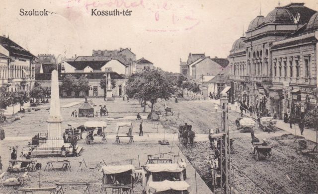 Valamikor 1906-ban vagy 1907-ben lehetett az a piaci nap, aminek a végén, a Steiner-házból valaki megörökítette Szolnok főterét. A városháza előtt zsákokkal megrakott szekerek, a mai könyvtár oldalában szétrakott kosarak. De már macskaköves az út, van közvilágítás és hirdetőoszlop is.