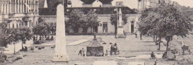 A kép születésének lehetséges utolsó dátumára, az 1907-re, a téren lévő fákból és korábban feladott képeslapokból következtetek. Van ugyanis olyan, a postai bélyegző alapján 1907-ben feladott, a mai könyvtár előtti részt ábrázoló képeslapom, amelyen nagyjából ugyanakkorák a fák, mint ezen a fotón. Korábban már írtam arról, hogy a Kossuth téri fák XX. századi története egy külön tanulmányt megérne, hiszen az ezen a képen látható, a század elején vagy legfeljebb a századforduló környékén ültetett fák a két világháború között eltűntek. Majd az akkor ültetettek az ötvenes években, hogy aztán a hatvanas évek növényzetét már a XXI. század elején alakítsák át.