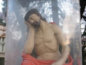 Az interneten megnézve az ilyen ábrázolású szobrok neve általában Búsuló vagy Szomorú Krisztus. Azt, hiszem XIX. századi ábrázolásmód lehet, és a ferences templomok környékére jellemző.