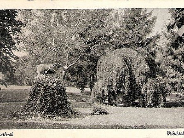 Sokáig gondolkodtam azon, hogy érdemes-e ezt a képeslapot közzétennem, hiszen a fotós oldalán nem sok érdekességet látok. A felirat alapján kénytelen vagyok elhinni, hogy a felvétel Szolnokon, azon belül is a mai művésztelepen készült. A kép kvázi közepébe komponált szoborról sem tudom megmondani, hogy létezik-e még, avagy mikor állhatott a város egyik legszebb kertjében. Az tűnik számomra biztosnak, hogy a felvétel még a háború előtt készült, viszont a vele forgalmazott képeslap a világégés után is forgalomban volt.