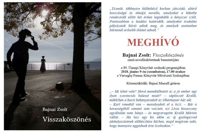 – A Verseghy könyvtár Művészeti szalonjában, a fiammal – Bajnai Marcell – mutatjuk be a Visszaköszönés című kötetet, amiért igazán hálás vagyok az intézménynek, hisz bevettek a 89. Ünnepi könyvhét szolnoki programjába. Marci saját dalai között fogok részleteket felolvasni a kötet novelláiból, remélve, hogy mások is kedvet kapnak hozzájuk. Talán lesz olyan olvasó, akit legalább annyira szórakoztatnak majd ezek a novellák, mint engem, amíg írtam őket.