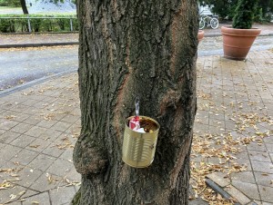 Csak egy apró csavar. A fa úgysem szól. Jobb lenne, ha szétdobálnák a csikket meg a szemetet a fa körül? Tekinthetjük ezt recycling-nak is, hiszen ez a kukává lett konzervdoboz végezhette volna egy kukában is, aztán meg egy szeméthegy gyomrában, ahol évszázadok alatt bomlik le. Most tényleg ez a legnagyobb baj? Milyen kép? Nehogy már ez az apró doboz rondítson bele a városképbe! Tudjunk már viszonyítani! Jóvanazúgy.