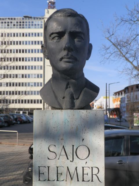A Magyar Képzőművészeti Főiskolán Mikus Sándor, Pátzay Pál és Kisfaludy Strobl Zsigmond tanítványaként induló Mészáros Mihálynak (1930-2008) közel félszáz köztéri alkotását tartja nyilván a nagyszerű Köztérkép.hu. Ezeket végignézve láthatjuk, hogy az ötvenes évek végén pályára lépő művész is számtalan felszabadulási és munkásmozgalmi jellegű szobrot készített, ugyanakkor portrék sorozata is köthető hozzá. Legismertebb alkotása talán a 2001-ben, az Ópusztaszeri Nemzeti Történelmi Emlékparkban felállított Anonymus-szobor. A szolnoki Sajó Elemér portré elkészítésére történő felkérésének körülményei előttem ismeretlenek, de talán közrejátszhatott ebben az is, hogy a nyolcvanas évek végén a Magyar Képzőművészek és Iparművészek Szövetségének külügyi referense, egyben a Magyar Iparművészeti Főiskola plasztikai tanszékének a tanára is volt, azaz egy elismert és elfogadott alkotóról lehetett szó.