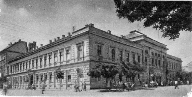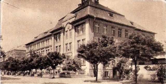 Természetesen a másik két fotóról is érdemes pár szót mondani. A felső, a készítés pillanatában talán Tanácsköztársaság utat megörökítő felvétellel, aminek előterében az akkori nevén Szamuely Tibor Gépipari Szakközépiskola látható, már önálló képeslapként is találkoztam. Érdekessége a fotó jobb szélébe belógó épület, ami mintha nyilvános vécé lett volna, és még a nyolcvanas években is ott díszelgett volna az Eötvös tér sarkán. Nem vagyok benne biztos, de nekem úgy tűnik, mintha ezen a képen is lenne egy csillag, mégpedig a Gépipari bejárata fölötti boltívben. Volt vagy tévedek?