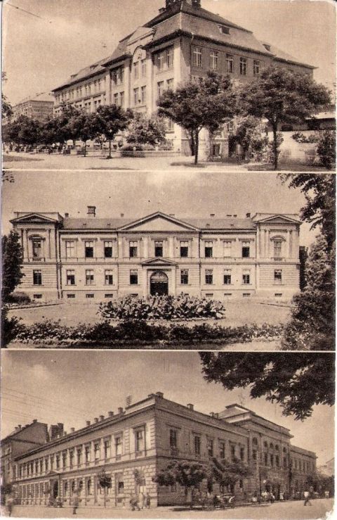 A három fotóból álló képeslapot, az ára (60 fillér), a képek és felirat alapján, szerintem az ötvenes évek végén adhatta ki a Képzőművészeti Alap Kiadóvállalata. A felső képen a Gépipari, középen a megyeháza, legalul pedig a Kossuth téri városháza, akkori szóhasználat szerint tanácsháza látható. Ez utóbbi az, ami miatt megvettem az egyébként posta tiszta lapot, és most foglalkozok vele.