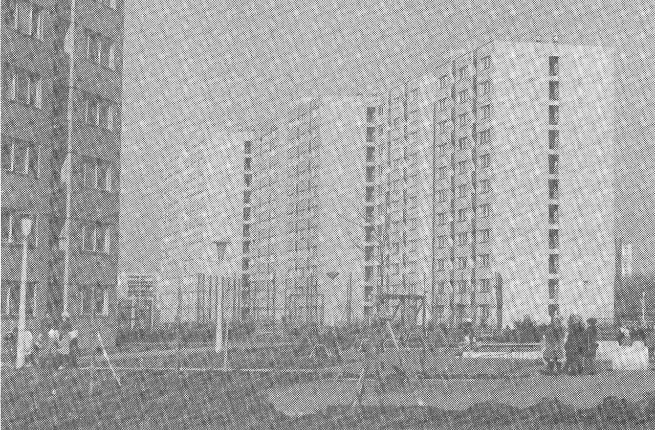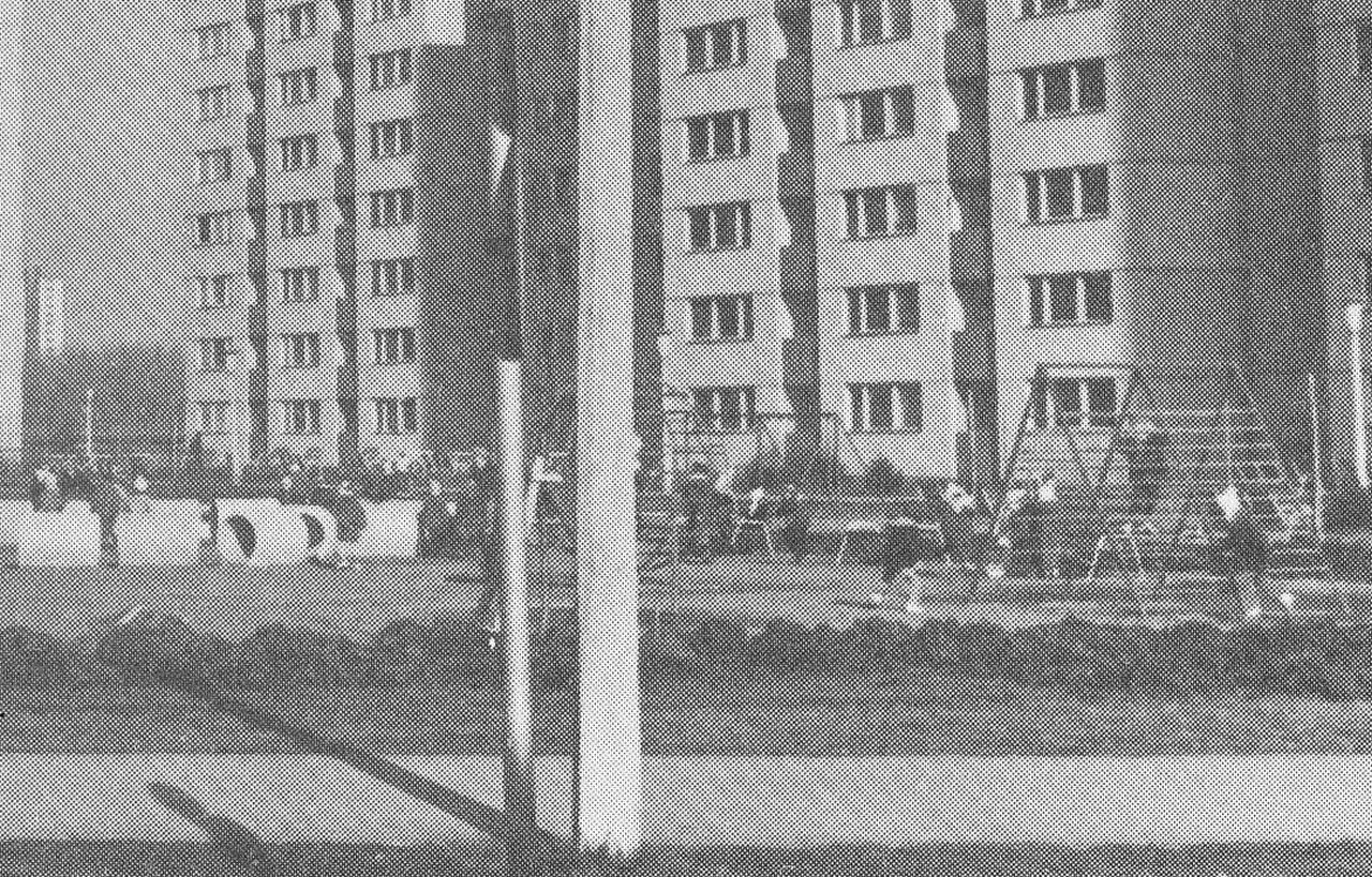 A mellékelt fotó valamilyen dossziékiadványból – azaz nem összefűzött vagy bekötött könyvből – maradt fenn, amely A4-es lapokra nyomtatott szolnoki fotókon és képaláírásokon volt hivatott bemutatni harminc év fejlődését. Minden bizonnyal a város első írásos említésének közelgő 900 éves évfordulója is inspirálhatta a nyomdai termék kiadását, így nem véletlen, hogy a hetvenes évek elején új, Móra Ferenc úti lakótelep is helyet kapott benne. A képet nézegetve nem nehéz kitalálni, hogy jobb oldalon a mai Szolnok Ispán – egykori Kun Béla – körúti tízemeleteseket látjuk, míg balra az egykori Domus mögötti panel lóg be a képbe. Azaz a fotós háta mögött az Ady Endre útra merőleges tízemeletes volt, előtte pedig az a terület, ahová éppen néhány hónapja került parkoló a bútoráruházba költözött multi miatt.