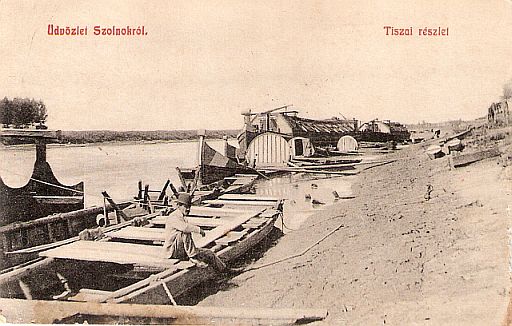 Olyan ez a kép, mint egy festmény. Állnak a bőgős hajók a Tiszán, ki- vagy berakodásra várnak, körülöttük pallók, tutajok, kisebb csónakok, és egy ember, aki valamire vár. Akinek láthatóan valami köze van a hajókhoz, a vízi szállításhoz, a Tiszához. Aki bő száz éve vagy Szolnokon élt, vagy ott járt, de az biztos, hogy zseniális zsánerkép alanya lett.