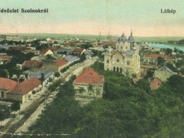 Mivel Szolnokon semmiféle természetes magaslat nincs, és repülővel is nagyjából a második világháború környékétől lehetett fölébe szállni, az új perspektívákat kereső fotósok már a XIX. század végétől előszeretettel másztak fel masináikkal a város templomainak tornyaiba. Így tett ennek az eredetileg fekete-fehér fotónak a készítője is. Aki aztán vagy maga, vagy a negatívot eladva, már a képeslapot készítő új tulajdonos vagy valamelyik alkalmazottja színezte ki a felvételt.