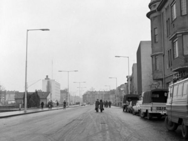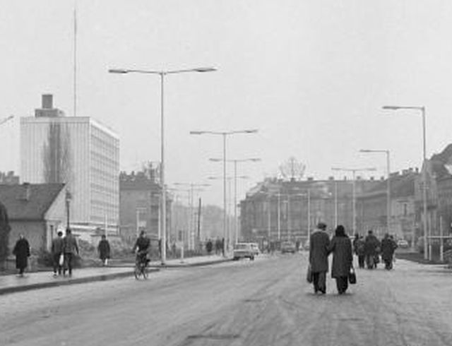 A Fortepanon elérhető képet 1974 kora tavaszán készítette az UVATERV, azaz az Út- és Vasúttervező Vállalat hivatásos fotósa. Ebből következik, hogy nem valamiféle turista, helyi fotóriporter vagy városvédő felvételéről van szó, hanem minden bizonnyal a vállalat által tervezett 4-es főút átkelési szakaszának a dokumentálásáról. Talán nem tévedünk, ha azt mondjuk, hogy az 1948-ban alapított cég munkatársa az építkezés egy köztes állapotát örökítette meg, hiszen a festések nélküli út még messze lehetett a végleges, 1975-ös állapotától.